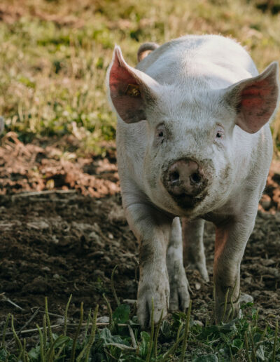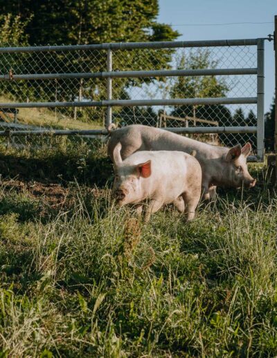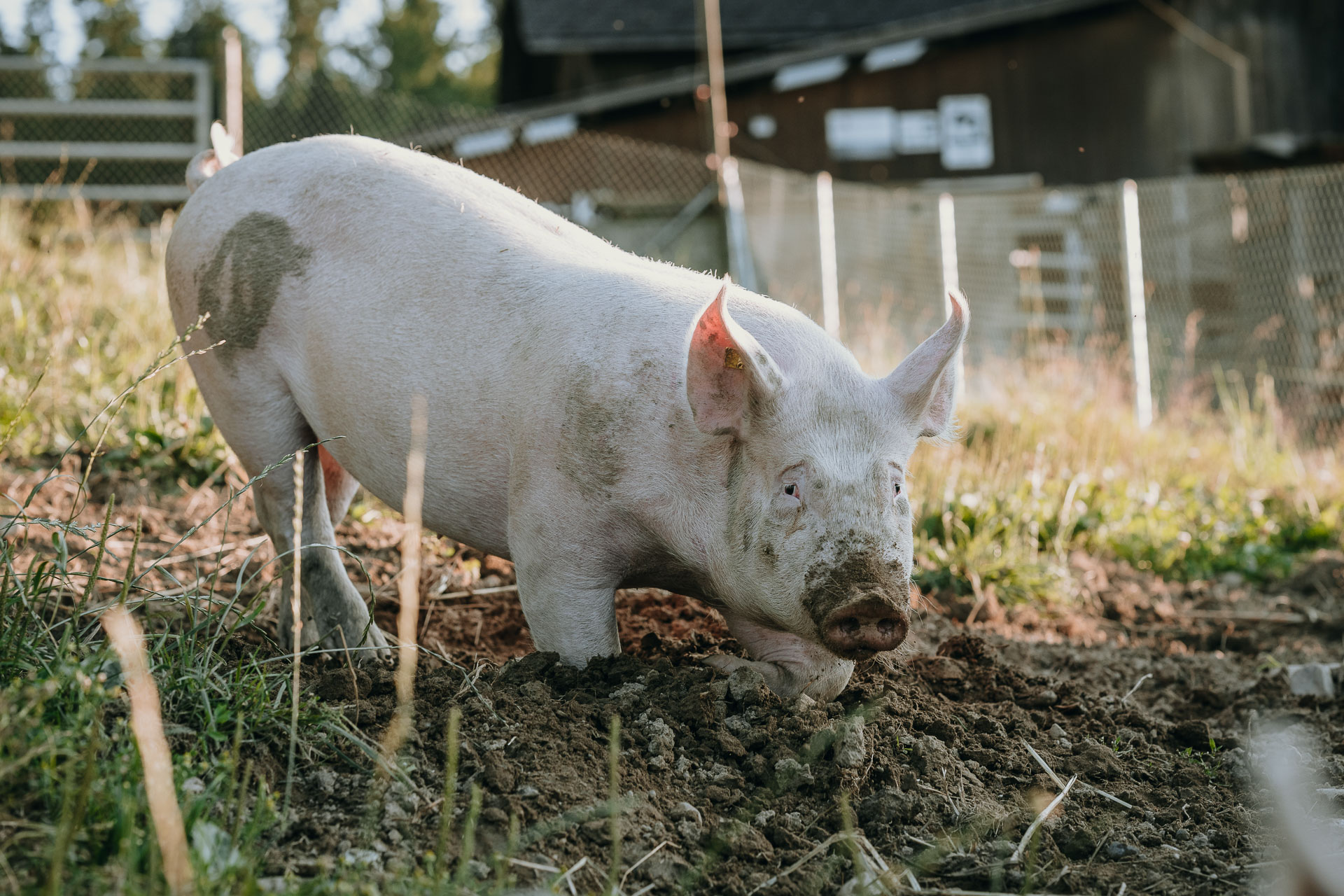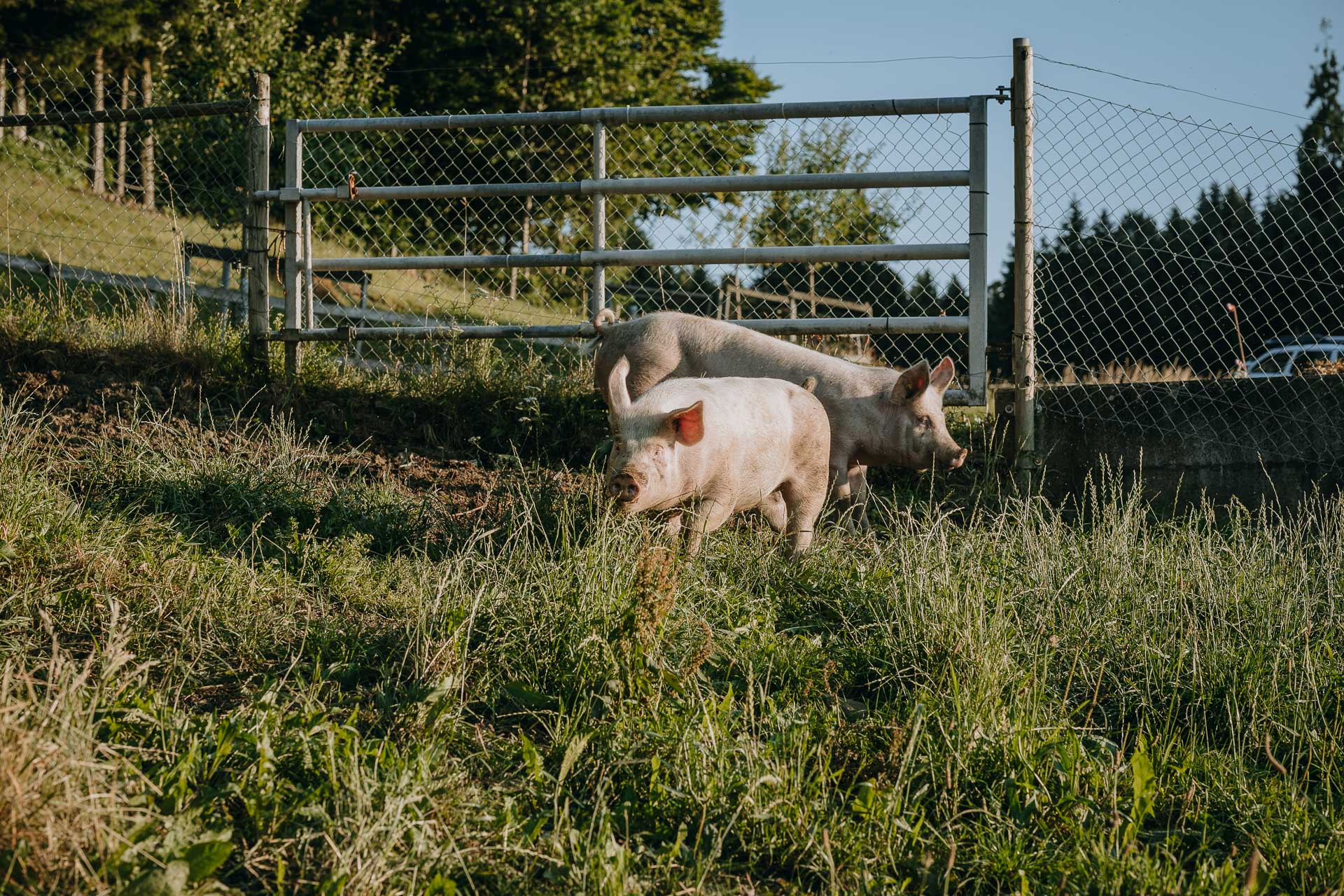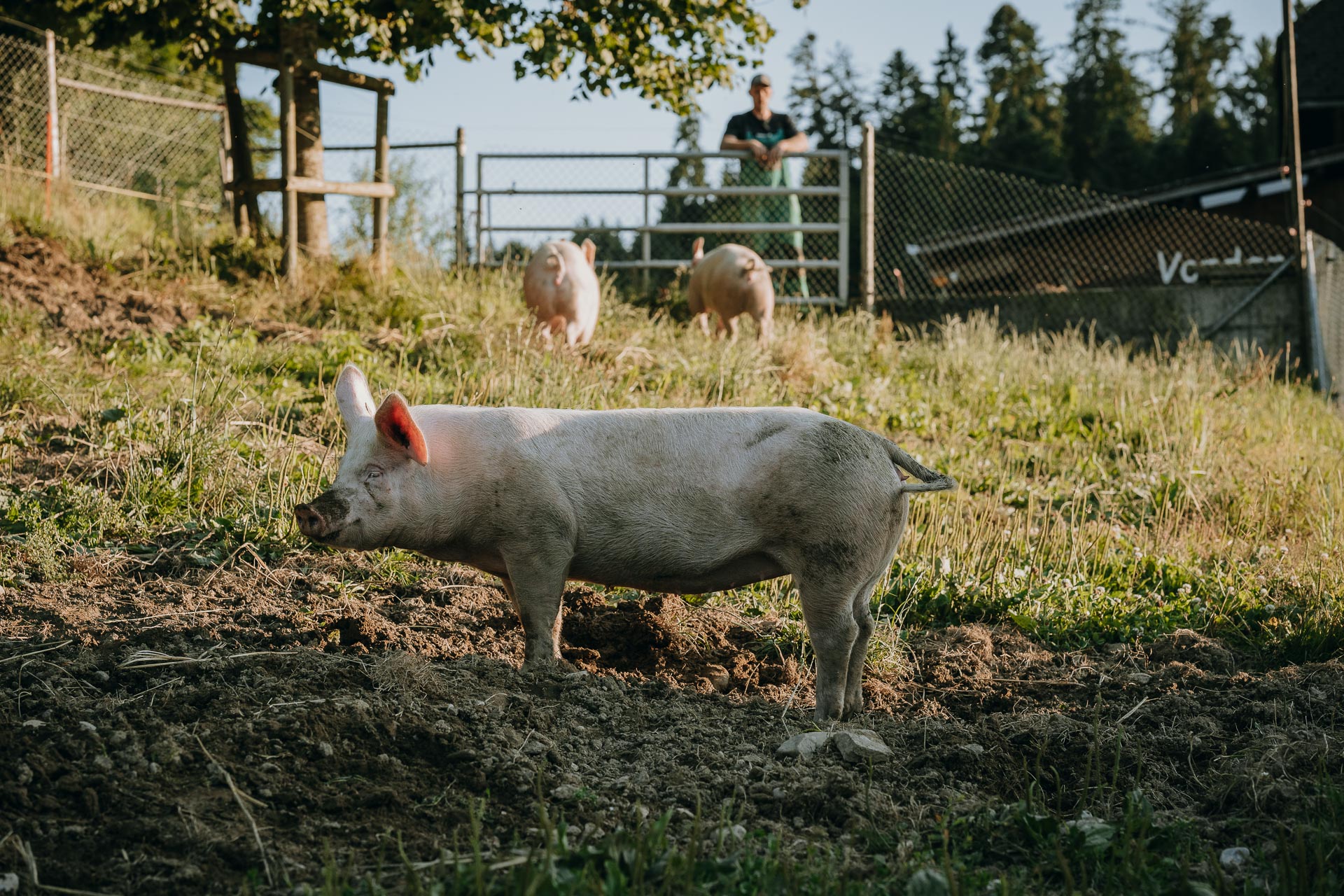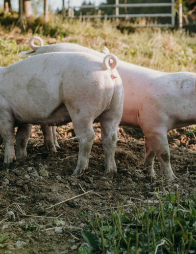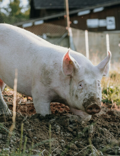 Zwei bis drei Mal im Jahr halten wir auf unserem Hof Weideschweine, die sich im Auslauf austoben und im Schlamm wühlen können. Dabei geniessen sie frisches Weidegras und bestes Futter.