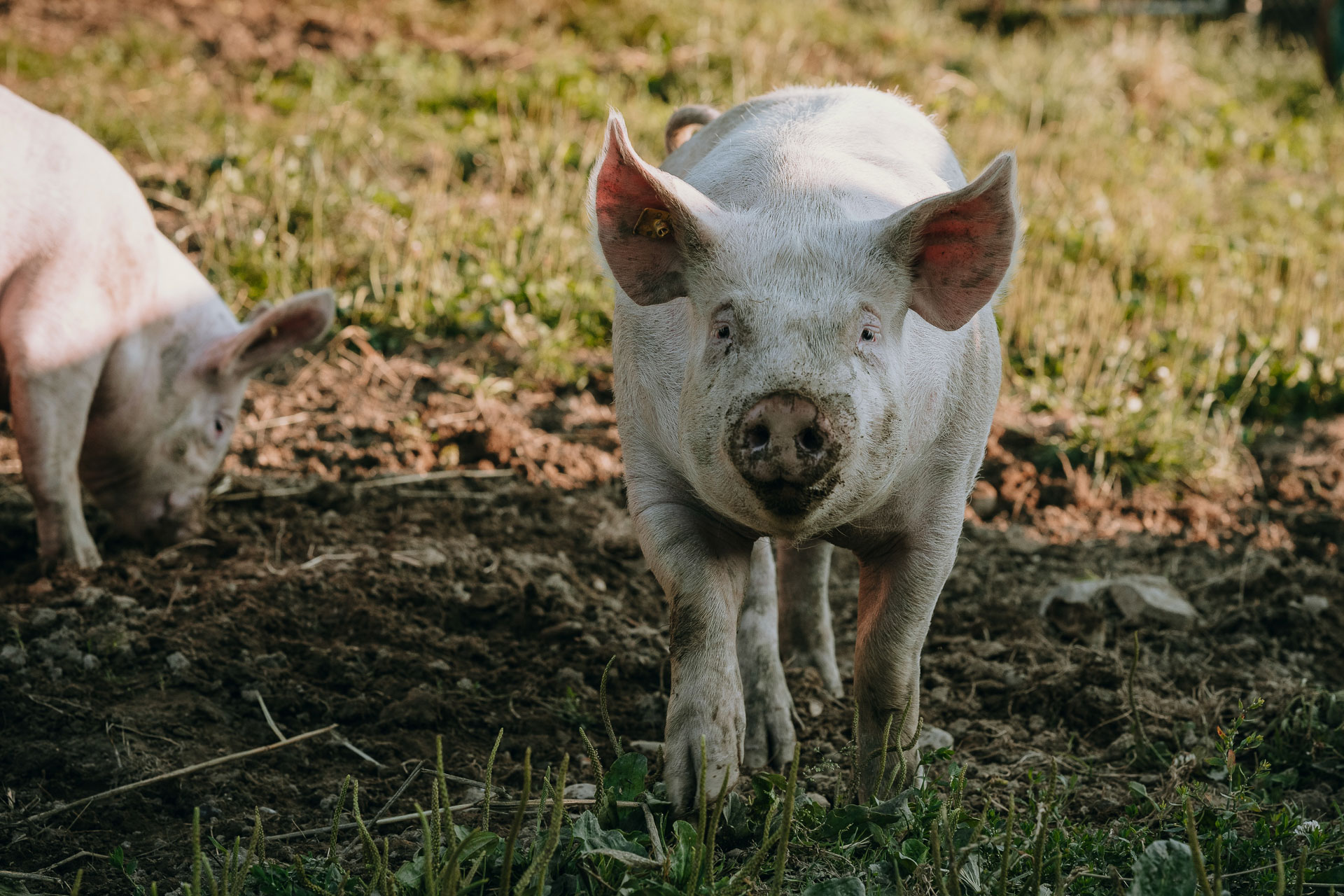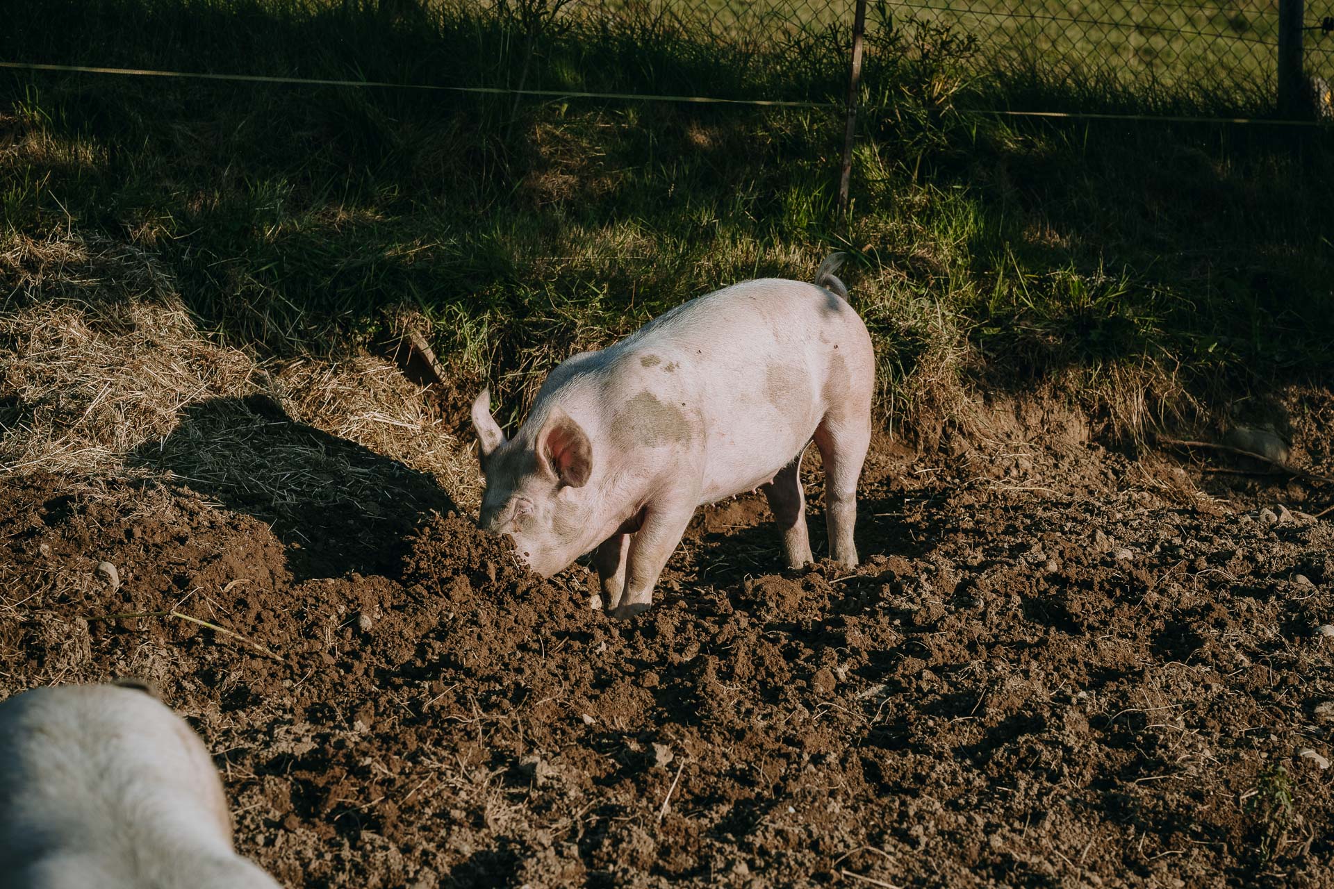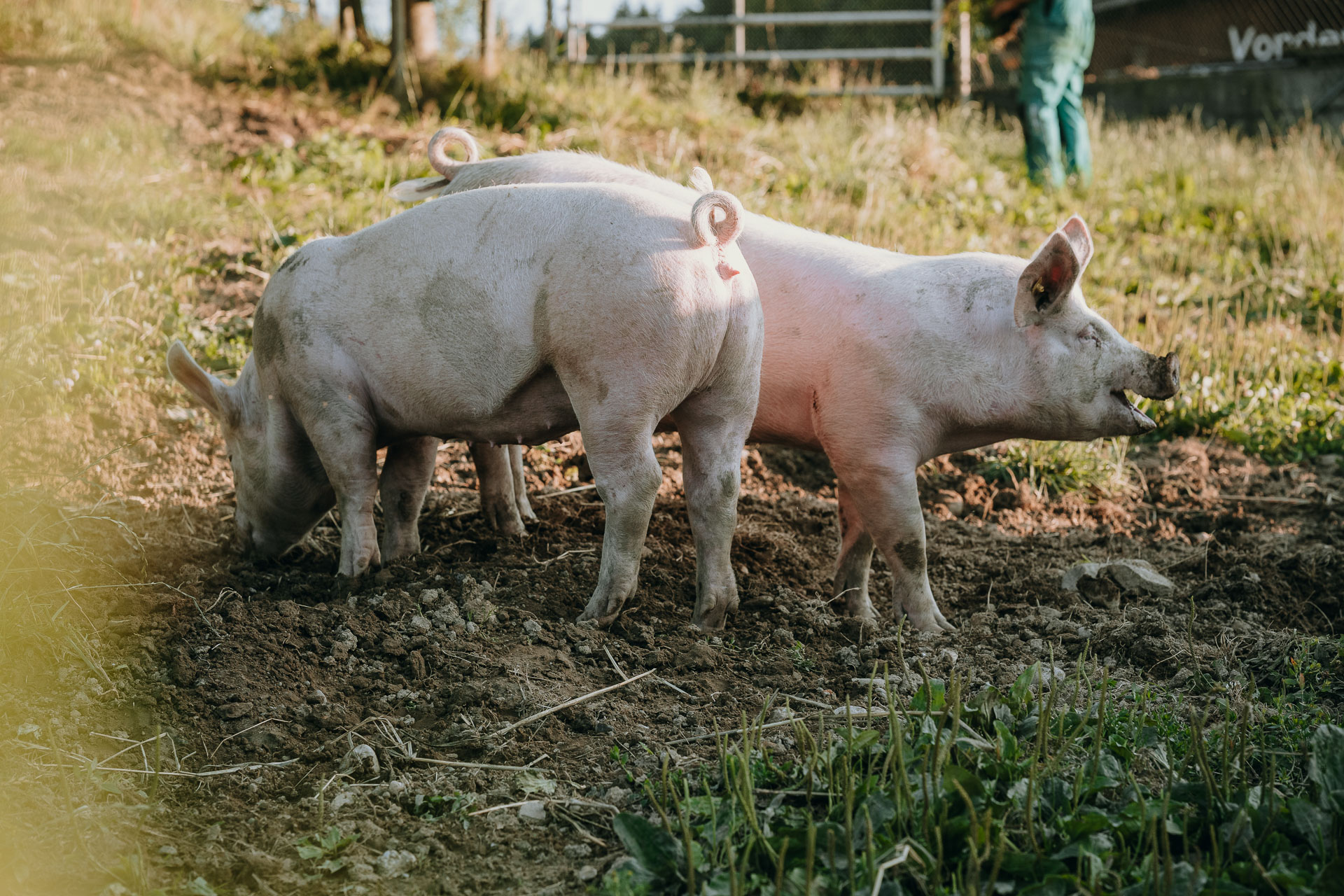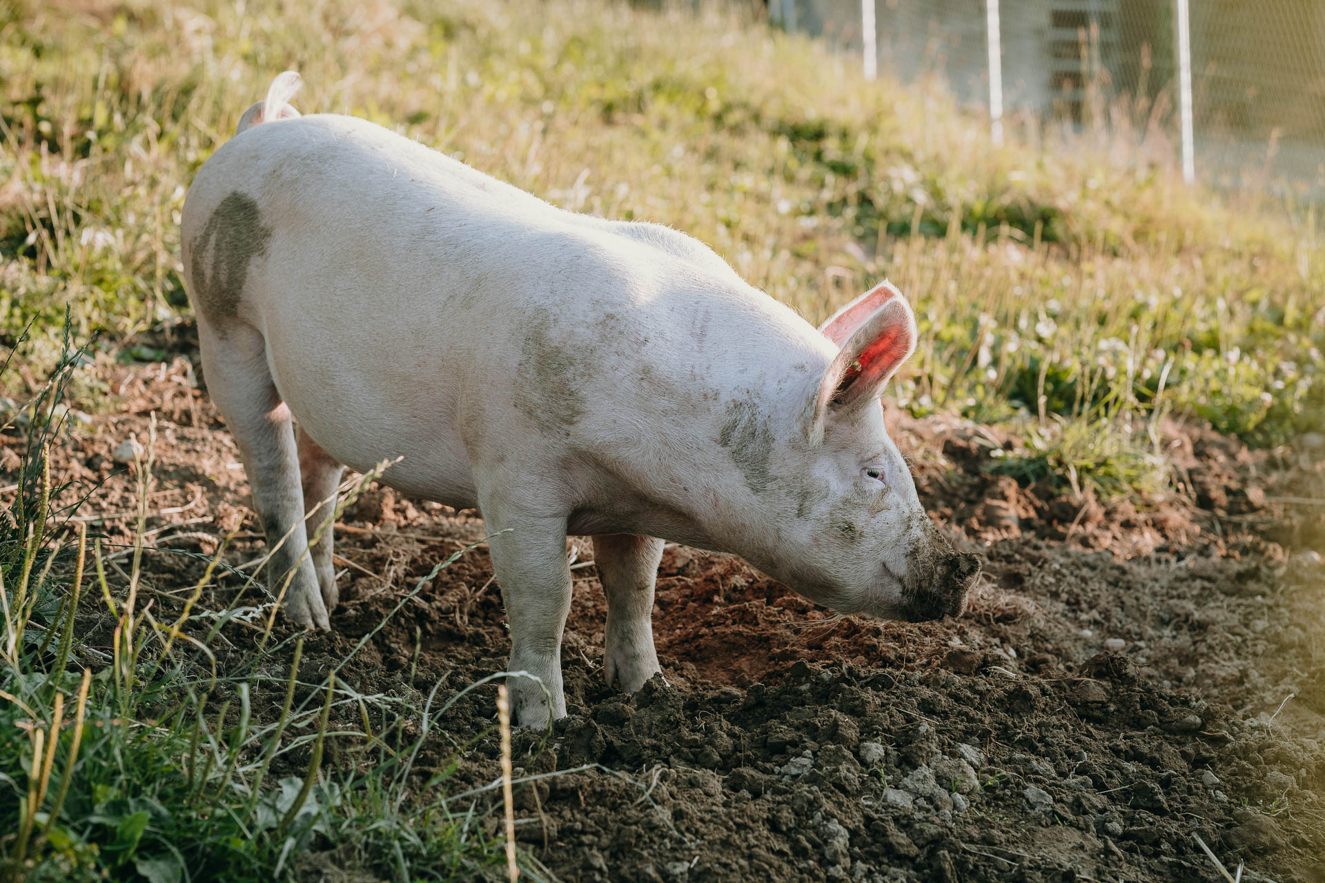 Zwei bis drei Mal im Jahr halten wir auf unserem Hof Weideschweine, die sich im Auslauf austoben und im Schlamm wühlen können. Dabei geniessen sie frisches Weidegras und bestes Futter.