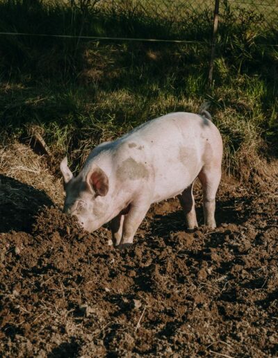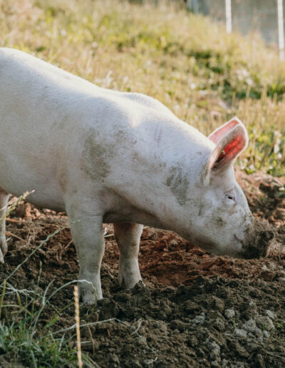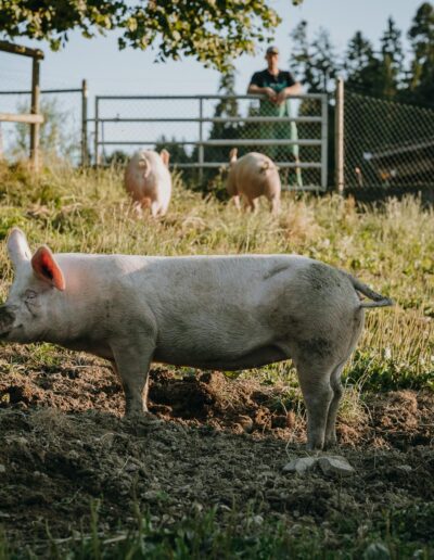 Das Fleisch stammt von unseren glücklichen Schweinen, die sich auf der grossen Weide frei bewegen, in der Erde wühlen und im Schlamm abkühlen können. Dabei erhalten sie stets bestes Futter. Das zarte, aromatische Fleisch aus artgerechter Haltung wird sorgfältig verarbeitet und vakuumiert verpackt.
