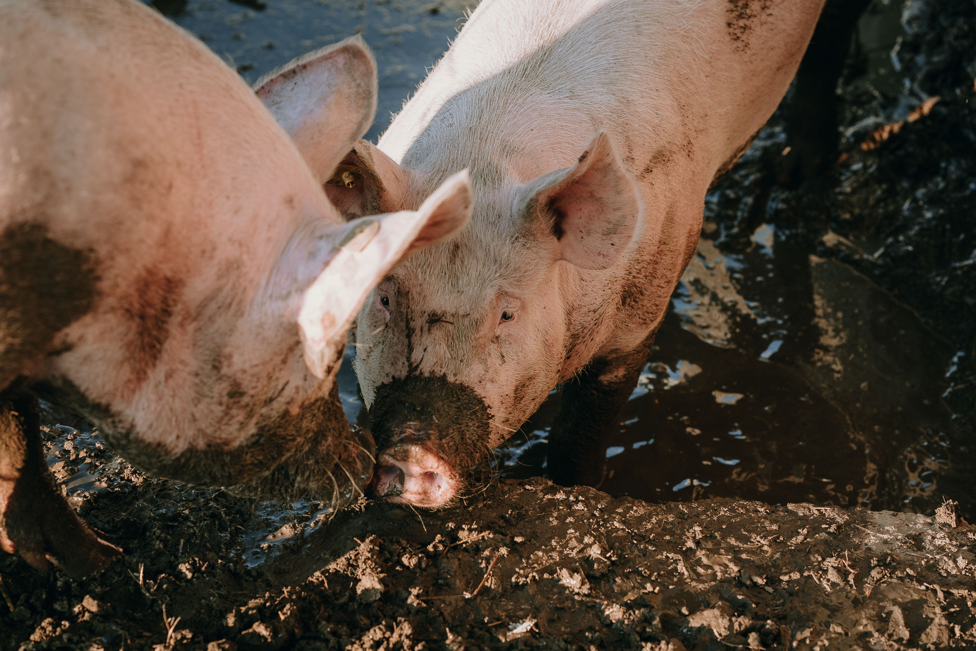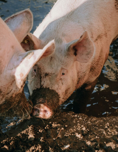 Bei besten Bedingungen können sich unsere Freilandschweine prächtig entwickeln. Im Gegensatz zu Mastschweinen, leben sie unter Tageslicht mit 24/7 Weidezugang und Auslauf. Neben leckerem Futter geniessen sie das Wühlen auf der Wiese und gönnen sich im Schlammbad eine Abkühlung.